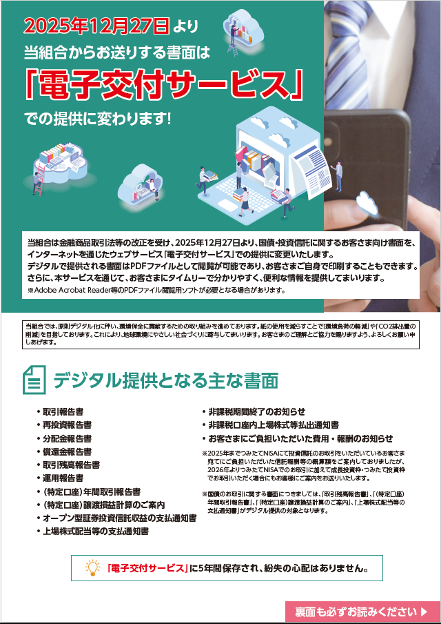 大分県信用組合は金融商品取引法等の改正を受け、2025年12月27日より、国債・投資信託に関するお客さま向けの書面を、インターネットを通じたウェブサービス「電子交付サービス」での提供に変更いたします。デジタルで提供される書面はPDFファイルとして閲覧が可能であり、お客さまご自身で印刷することが可能です。